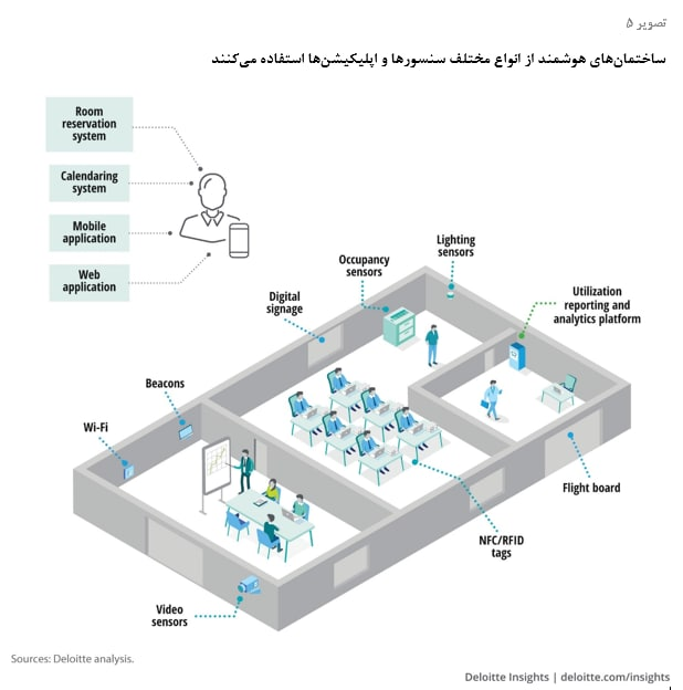 ظهور دستگاه‌های اینترنت اشیای هوشمند و همواره متصل، فرصتی ایجاد کرده است تا ساختمان‌ها- اعم از دفاتر، فروشگاه‌های خرده‌فروشی، کارخانه‌ها یا بیمارستان‌ها- به محیط‌هایی مقرون به صرفه و پاسخگو برای ارائه تجربیات استثنایی به استفاده‌کنندگان خود تبدیل شوند. ساختمان‌های هوشمند سازه‌های متصل دیجیتالی هستند که برای بهبود تجربه کاربر، افزایش بهره‌وری، کاهش هزینه‌ها و کاهش خطرات فیزیکی و امنیت سایبری، اتوماسیون ساختاری بهینه و عملیاتی را با مدیریت فضای هوشمند ترکیب می‌کنند. ساختمان‌های هوشمند و دیجیتالی صنایع و کاربردهای مختلفی را در بر می‌گیرند، اما همه‌ی آن‌ها می‌توانند قابلیت‌های اساسی یکسانی را فراهم کنند: آنها انسان‌ها را به هم متصل می کنند، کنترل بهتری بر امکانات و عملیات فراهم می‌کنند، از راه‌های همکاری دیجیتالی پشتیبانی می‌کنند و دارندگان را قادر می سازند تا در استفاده از منابع، از جمله فضا، انرژی، آب و کارمندان صرفه‌جویی کنند. هر یک از این چهار قابلیت می‌تواند مبنایی برای ایجاد یک استراتژی هوشمند‌سازی ایجاد کند که می‌تواند مزایای قابل اندازه‌گیری داشته باشد. شکل 5 برخی از انواع مختلف حسگرها و برنامه‌هایی را که می‌توان در یک ساختمان هوشمند استفاده کرد نشان می‌دهد.
